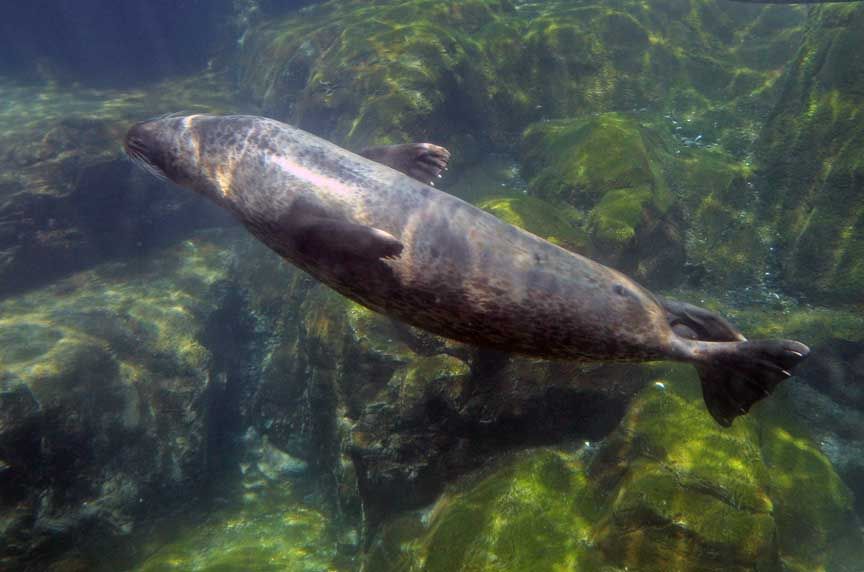 Pinnipeds or fin-footed mammals are a widely distributed and diverse group of semiaquatic marine mammals comprising the families Odobenidae (the walrus), Otariidae (eared seals, including sea lions and fur seals), and Phocidae (earless seals). They are typically sleek-bodied and barrel-shaped. Their bodies are well adapted to the aquatic habitat where they spend most of their lives. Their limbs consist of short, wide, flat flippers. The smallest Pinniped, the Baikal seal, weighs about 150 lbs on average when full-grown and is about 4 feet long; the largest, the male southern Elephant Seal, is over 12 feet long and weighs over 8,000 lbs.