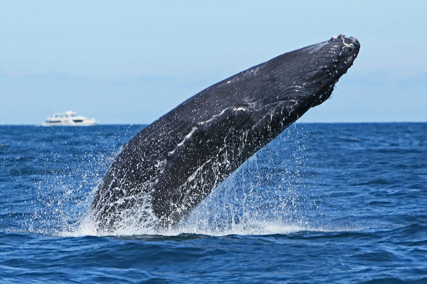 The magnificent Humpback whale is a favorite animal for whale watching tours and is renowned for its impressive leaping displays and for the mysterious 'singing' of solitary males. Humpbacks can grow to over 45 feet in length and weigh over 30 tons. The robust body is blue-black in color, with pale or white undersides. The flippers may also be white and are the largest appendage of any animal; reaching up to 15 feet in length. On the underside of the mouth are 12 to 36 throat grooves, which can expand when filtering water during feeding. Humpback whales have characteristically knobbly heads, covered in many raised lumps ('tubercles') and barnacles.