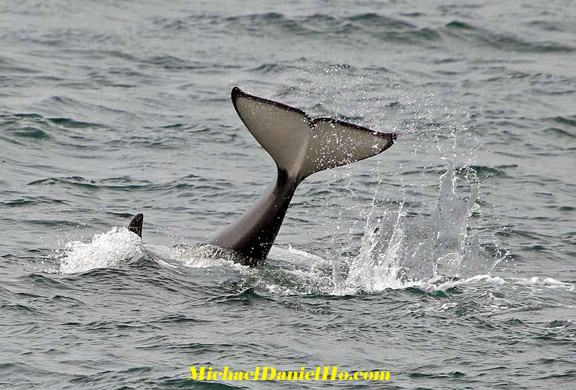 Both the male and female Killer Whales have a broad, rounded head and snout, an enlarged forehead, large, paddle-shaped pectoral fins and a large dorsal fin. However, males grow larger than females, and on reaching maturity become stockier and develop disproportionately larger fins, with adult males easily recognized by the tall, erect dorsal fin, which is the largest of any cetacean, growing to an impressive 6 feet in height. The female Orca, by contrast, has a more backward-curving dorsal fin , which grows to about 3 feet in height. An Orca’s dorsal fin and saddle patch are unique to each individual.
