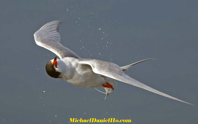 Terns belongs to a family of birds known as Sternidae. They are, in general, medium to large birds, typically with grey or white plumage, often with black markings on the head. They have longish bills and webbed feet. They are lighter bodied and more streamlined than gulls, and look elegant in flight with long tails and long narrow wings. Terns range in size from the Least Tern, at 1.5 oz and 9 inches, to the Caspian Tern, at 1.4 lbs and 21 inches. They make harsh, single-note calls. Many terns breeding in temperate zones are long-distance migrants, and the Arctic Tern probably sees more daylight than any other creature, as it migrates from its northern breeding grounds to Antarctic waters.