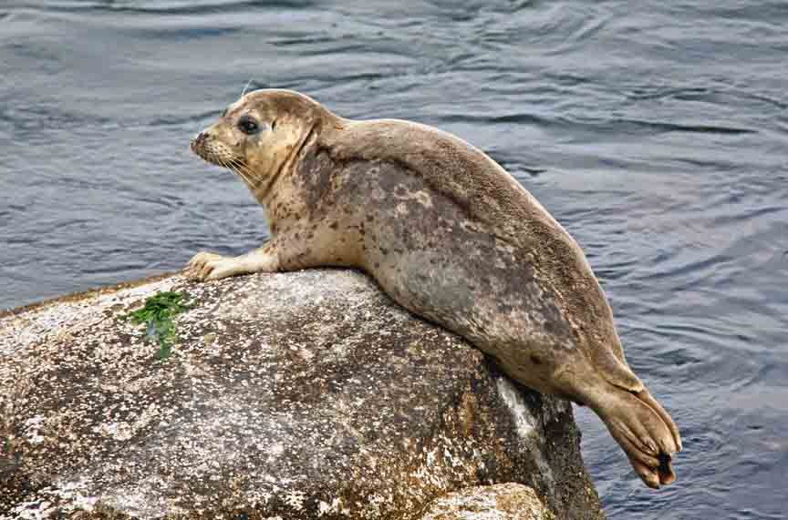 Pinnipeds or fin-footed mammals are a widely distributed and diverse group of semiaquatic marine mammals comprising the families Odobenidae (the walrus), Otariidae (eared seals, including sea lions and fur seals), and Phocidae (earless seals). They are typically sleek-bodied and barrel-shaped. Their bodies are well adapted to the aquatic habitat where they spend most of their lives. Their limbs consist of short, wide, flat flippers. The smallest Pinniped, the Baikal seal, weighs about 150 lbs on average when full-grown and is about 4 feet long; the largest, the male southern Elephant Seal, is over 12 feet long and weighs over 8,000 lbs.